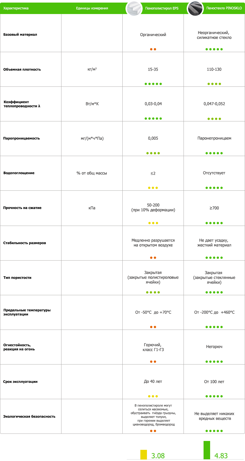Пенополистирол EPS (экспандированный пенополистирол), является худшим материалом в сравнении с утеплителем пеностеклом по ряду причин. Он проигрывает по показателям прочности, что ставит под сомнение возможность его применения в ряде конструкций, а также является достаточно эластичным материалом, который под воздействием нагрузок прогибается.